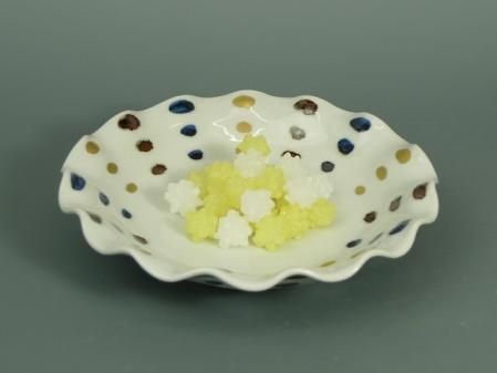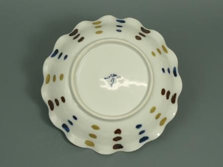 皿の縁に波を持たせ縁周りの内面、外面には藍色・茶賣・金色の点々をシンプルでモダンに配しました。